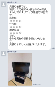 その際は、最初にご用件(見積もり依頼)・お名前・住所・ご連絡先の4点のメッセージを送り、その後に写真をお送り下さい。(下記のスマホ画面の画像をご参考にしてください)